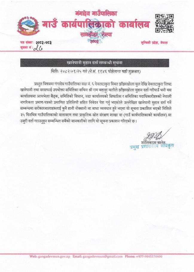 » खानेपानी मुहान(झाँझरखोला) दर्ता सम्बन्धि सूचना