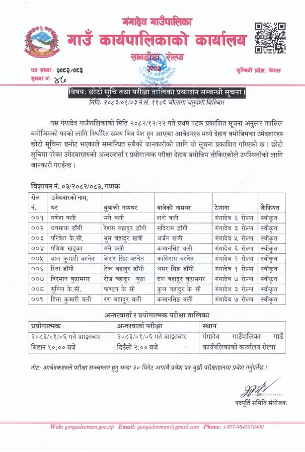 छोटो सूचि तथा परीक्षा तालिका प्रकाशन सम्बन्धि सूचना