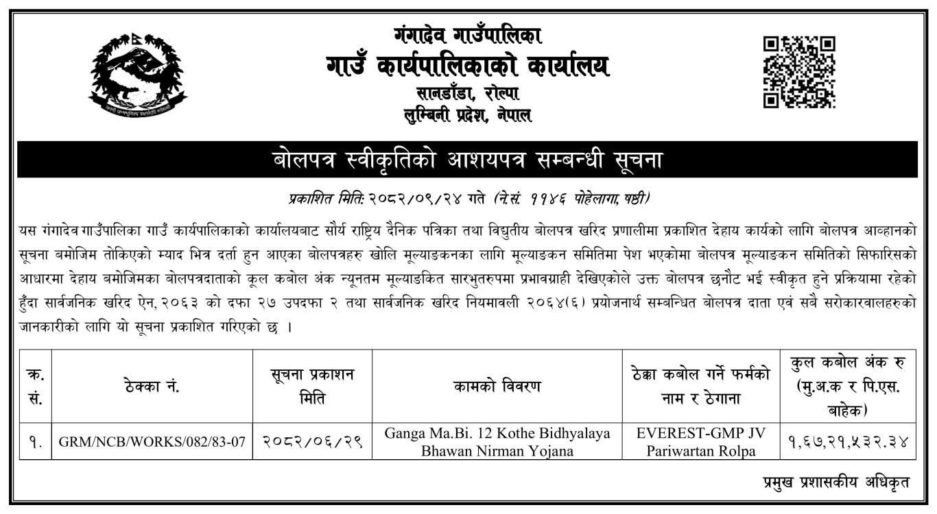 बोलपत्र स्वीकृत गर्ने आशयको सूचना