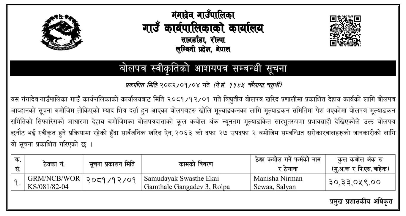 बोलपत्र स्वीकृत गर्ने आशयको सूचना
